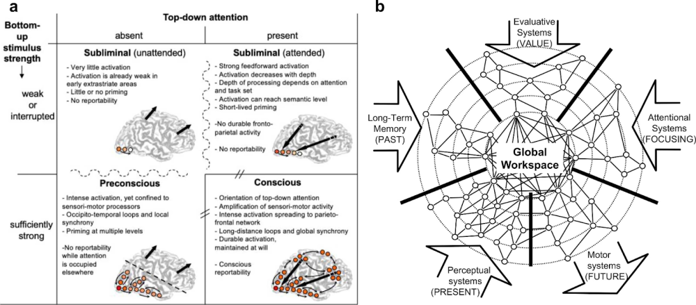 もう1つの影響力のある提案は、グローバル・ワークスペース理論です。ここでは、情報がシステム全体でグローバルに利用可能になり、複数のプロセスがそれに同時にアクセスして使用できるようになる時に意識が現れます(Baars, 1988; Dehaene & Changeux, 2011)。すべての処理が意識的なわけではなく、このグローバルな放送(ブロードキャスティング)レベルに達したものだけが意識的になります。