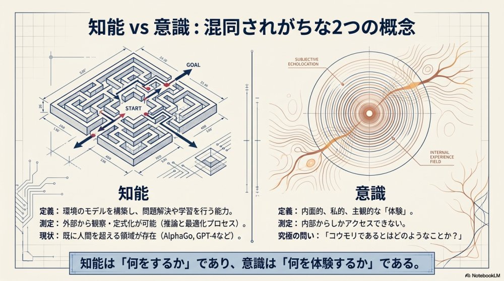 一方、意識とは、システムが何を行うかではなく、何を経験するかに関するものです。それは、内面的で、私的で、主観的な経験に関連しています。Thomas Nagelが有名な言葉を残しているように、「コウモリであるとはどのようなことか?(What is it like to be a bat?)」(Nagel, 1974)ということです。ここに根本的な違いがあります。知能は外部から観察できますが、意識は内部からしかアクセスできないのです。