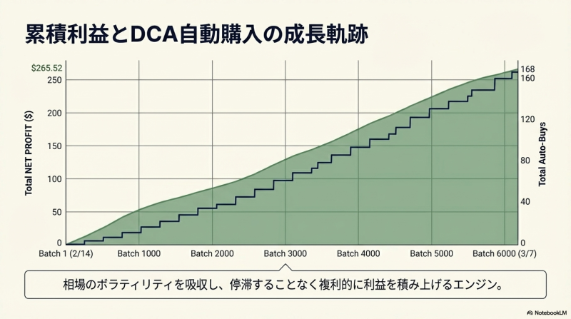 2026年2月19日の稼働開始(Batch 1)から最新の Batch 6000 に至るまでのログデータ(300刻み)を基に、QTC のトレードアルゴリズム「Ghost Spider」の長期的な運用推移と、そこから読み取れるアルゴリズムの特性を解説します。