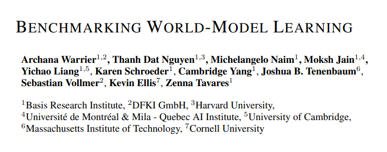 参考文献: Warrier, A., Nguyen, D., Naim, M., Jain, M., Liang, Y., Schroeder, K., & Tavares, Z. (2025). Benchmarking World-Model Learning. arXiv preprint arXiv:2510.19788.