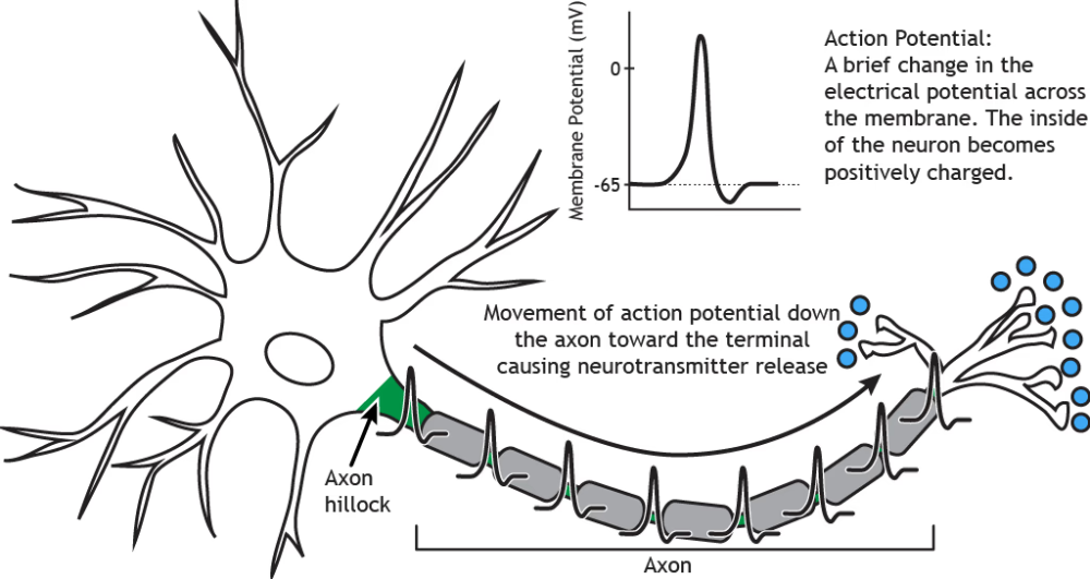 しかし、その送信(活動電位)に至る以前に、ニューロンは樹状突起と呼ばれる領域で正と負の入力を継続的に受け取っています。もしこれらの入力の総和がある閾値を超えると、物理的な構造変化が起こり、電流が軸索に沿って次のニューロンへと伝播します。
