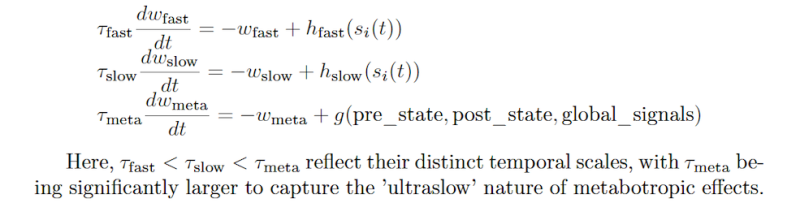 ここで、$\tau_{fast} < \tau_{slow} < \tau_{meta}$ はそれぞれの異なる時間スケールを反映しており、$\tau_{meta}$ はメタボトロピック効果の「超低速」な性質を捉えるために著しく大きくなっています。この数学的枠組みは、Northoff & Huang (2017) が脳の時間ダイナミクスがいかに意識を媒介するかについて述べたように、ニューロモジュレーションが高速なシナプス伝達よりもはるかに遅い時間スケールで動作するという生物学的原理を直接実装しています。