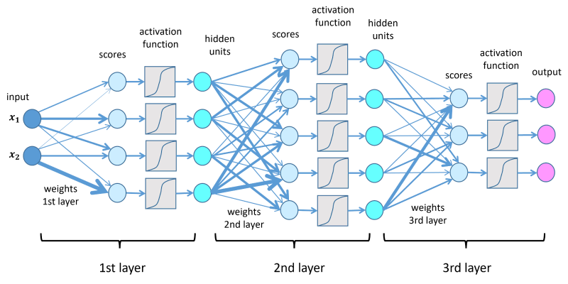 各人工ニューロンは3つのステップを実行します。第一に、一連の数値入力を受け取ります。次に、各入力にシナプス重み(調整可能なパラメーター)を掛け合わせます。最後に、その結果を合計し、非線形性を導入する活性化関数を適用します。一般的な活性化関数には、値を0と1の間に圧縮するシグモイドや、負の値をキャンセルして正の値を通過させるReLU(Rectified Linear Unit)が含まれます。