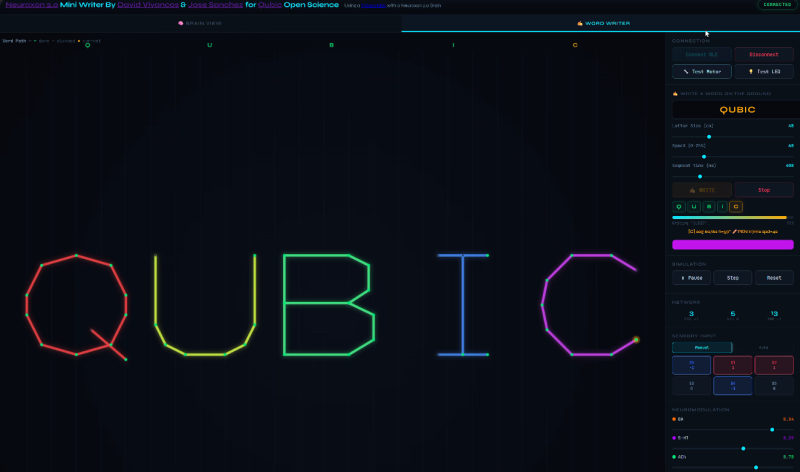 50ドル未満の Sphero Miniロボットボールを使用したデモでは、Neuraxon が移動ロジックの一部を駆動するハイブリッド制御が示されています。別のライティング(記述)アプリでは、ボールが任意の表面に「QUBIC」という文字をなぞるように動きます。
