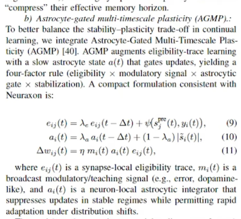 このアプローチは、スパイキング・ニューラルネットワーク向けに提案されたAstrocyte-Gated Multi-Timescale Plasticity (AGMP) フレームワークを含む、ニューロモルフィック・コンピューティングの最近の進歩と一致しています。このフレームワークは同様に、シナプスの更新をゲートする低速のアストロサイト状態によってエリジビリティ・トレース学習を拡張し、4要素学習ルール(適格度 × 調整信号 × アストロサイト・ゲート × 安定化)をもたらします。