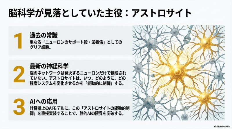 これまで脳内のサポート役と見なされてきた「アストロサイト」は、実はシナプス調節(三者間シナプス)に積極的に関与しています。神経伝達物質を検出し、ネットワークが「いつ、どのように、どの程度変化するか」という学習の土台(環境)をコントロールする重要な役割を担っています。