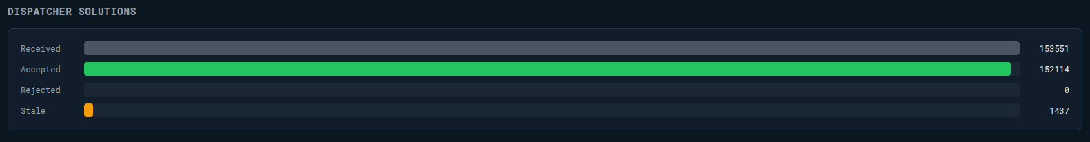拒否率(rejection rate)がゼロに近いのが理想的です。ステールソリューションは、レイテンシに関連する無駄を表しています。ここに表示されるステール率は、Qubicネットワークレベル(ディスパッチャーとQubicネットワーク間)のものであり、マイナーからプールへのレベルのものではありません。ステールソリューションは、ジョブがすでに置き換えられた後に作業がディスパッチャーに到着した場合に発生します。これは、イーサネットを使用し、地理的に近いStratumサーバーを選択することで減らすことができるASICとプールの間のステールシェアとは異なります。