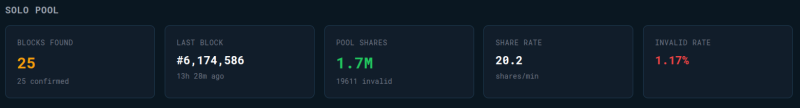 • Pool Shares(プールシェア): 内部で処理されたシェアの総数と無効(invalid)カウント(無効なシェアは、しきい値のミス、ステール送信、または不正確なハッシュなど、複数の原因から生じる可能性があります)