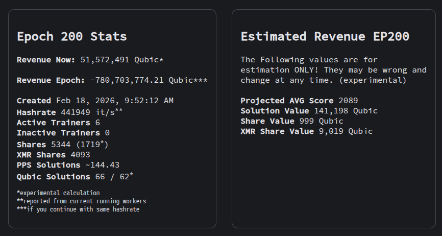 必要 Hashrate = $( 実績 Hashrate / 実績 SOL ) × ( Projected AVG Score / 50 )$ 実績からの算出したハッシュレート = $(441949/66)*(2083/50) = 278,963 (it/s)$