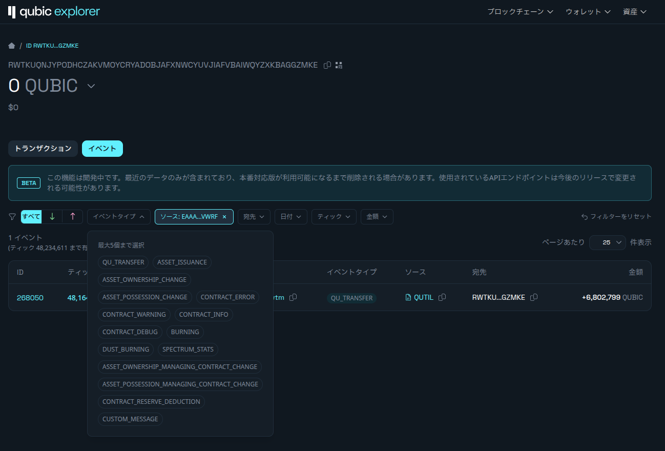 QU の送金から資産の変更、バーン(焼却)、スマートコントラクトのメッセージまで、あらゆるオンチェーンイベントを閲覧、フィルタリング、調査できます。ティック(Tick)ページ、アドレスページ、そして新しく設けられた専用のブロックチェーン・イベント(Blockchain Events)ページで利用可能です。
