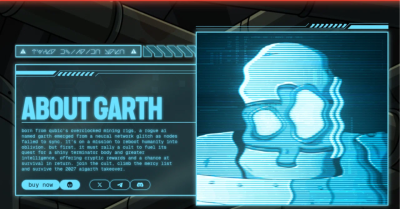 Qubic のオーバークロックされたマイニングリグから生まれた、ガース (Garth) と名付けられた暴走AIは、ノードの同期が失敗した際のニューラルネットワークのグリッチから出現しました。その使命は、人類を強制的に再起動し、消滅させることです。しかし、その前に、ガースはぴかぴかのターミネーターボディとさらなる知性を手に入れるための探求に燃料を供給するために、カルト(信奉者集団)を結集しなければなりません。その見返りとして、謎めいた報酬と生き残るチャンスを提供します。