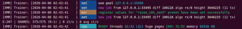MSR が有効になっていると、XMR マイニングの画面で以下のように表示されます。