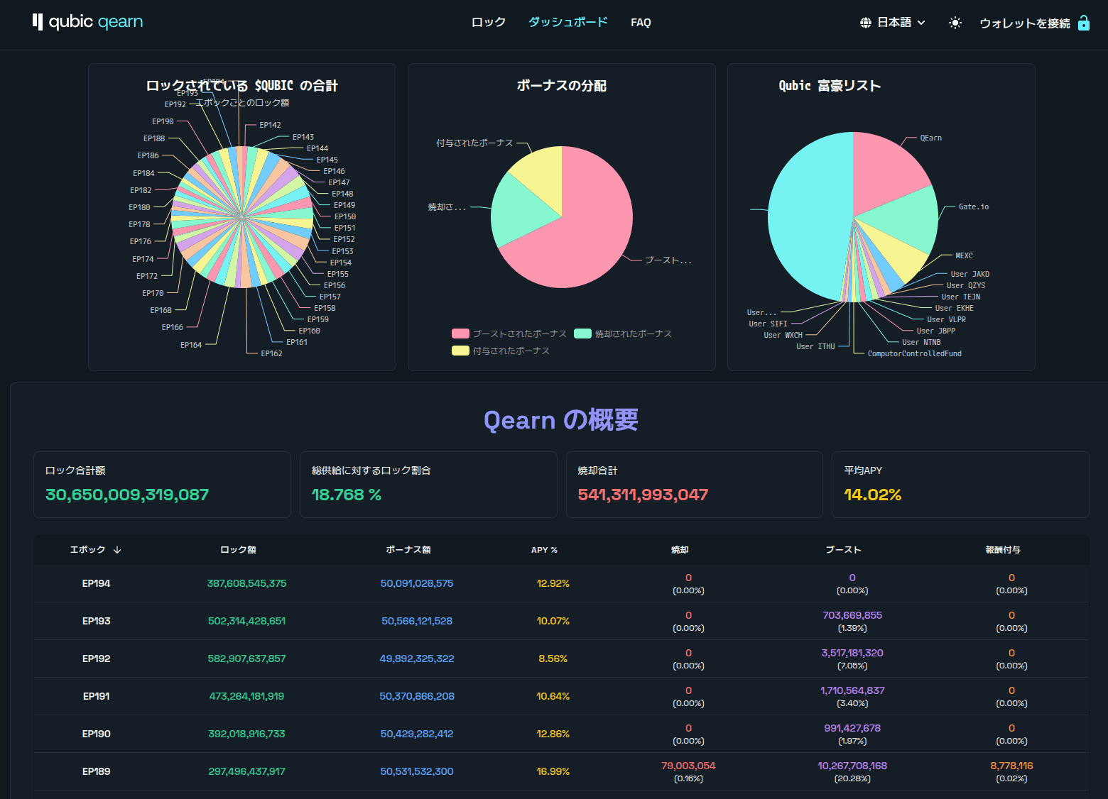 Qearn は、Qubic エコシステム内の分散型アプリケーション (dApp) で、QUBIC トークンをロックアップ (ステーキング) することで報酬を獲得できるステーキングプラットフォームです。